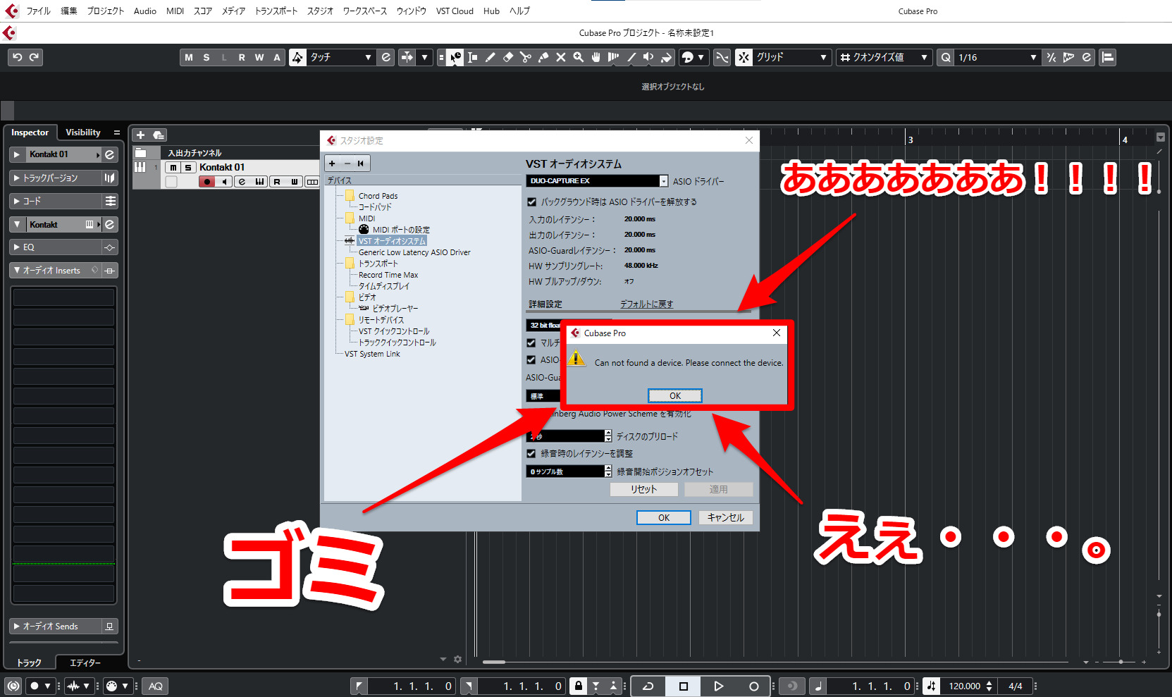 まぁ普通に画面の文言通り、使用しているオーディオインターフェースのボタンを押してOKをクリックすればなんとかなりそうなんですが、僕の場合はほぼ以下の画面になります。